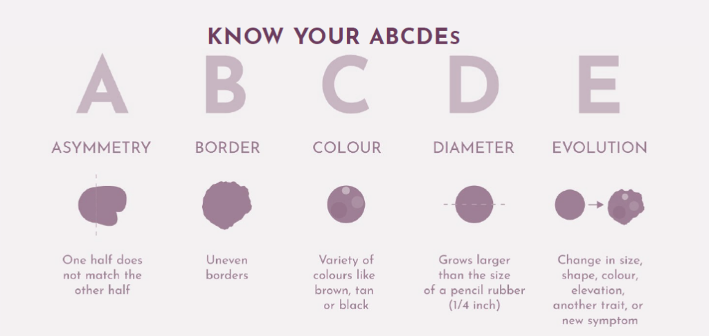 - D: Diameter – if a mole is getting bigger it should be reviewed.